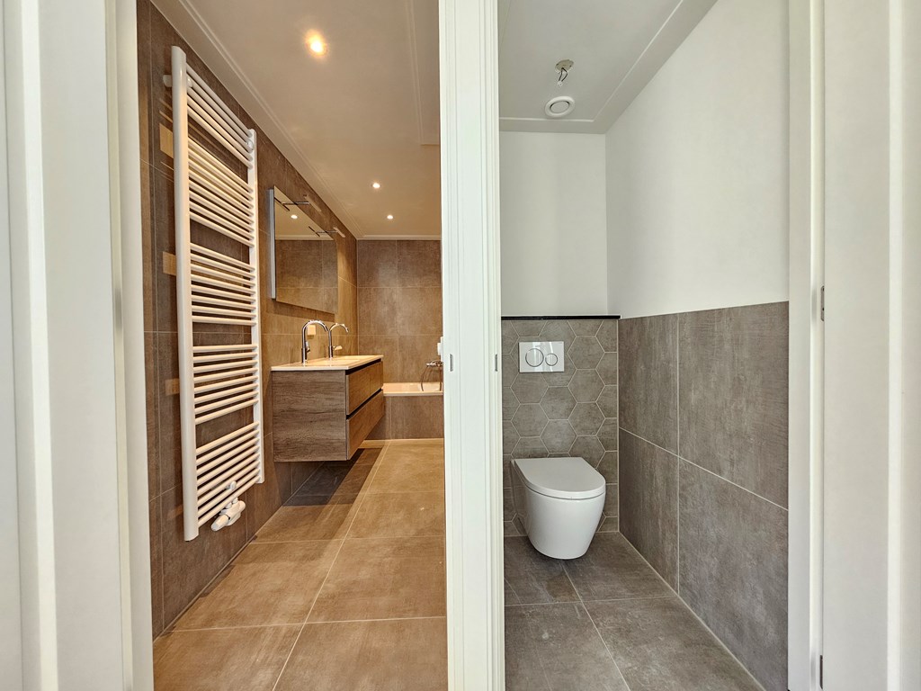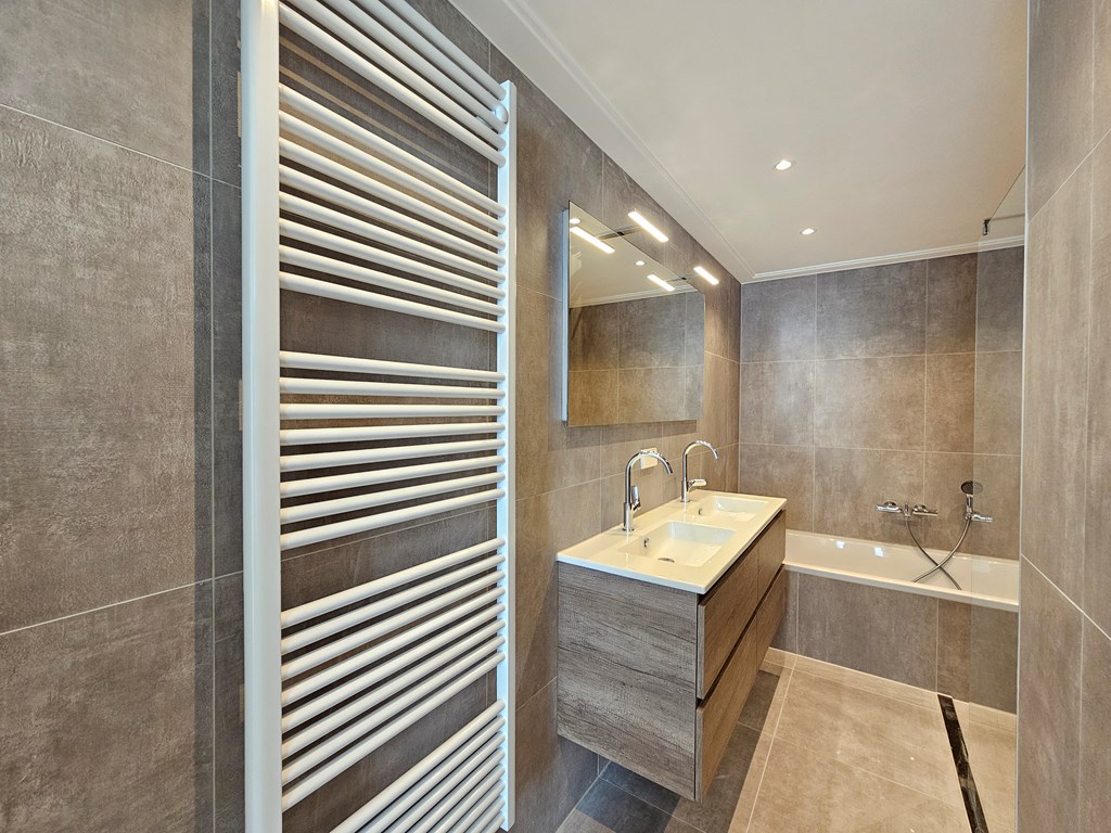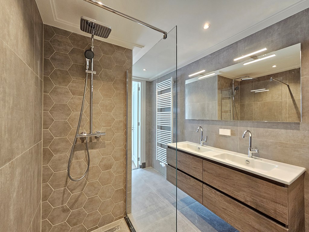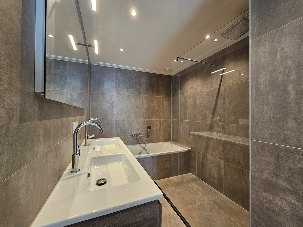 De moderne badkamer is luxe uitgevoerd met een dubbele wastafel, een ligbad en een inloopdouche. Het toilet is separaat.