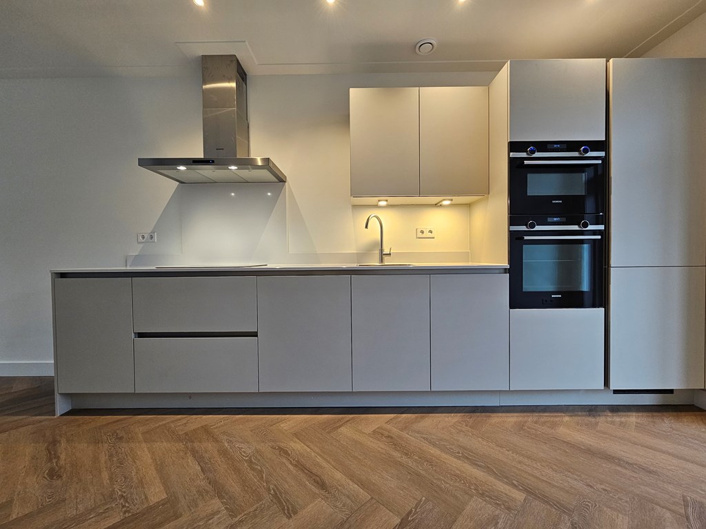 Aan de voorzijde is de woonkamer (ca.5.26x3.76=19.80m2) met een open keuken (ca.5.19x3.07=15,97m2) met natuurstenen aanrechtblad, 4-pits inductiekookplaat, combi oven/magnetron, grote koelkast/vriezer.
