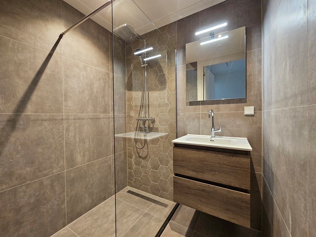 De badkamer (ca.1.75x1.49=2.62m2), met enkele wastafel en een inloopdouche. Het toilet is apart.