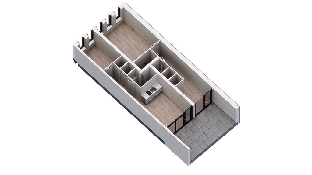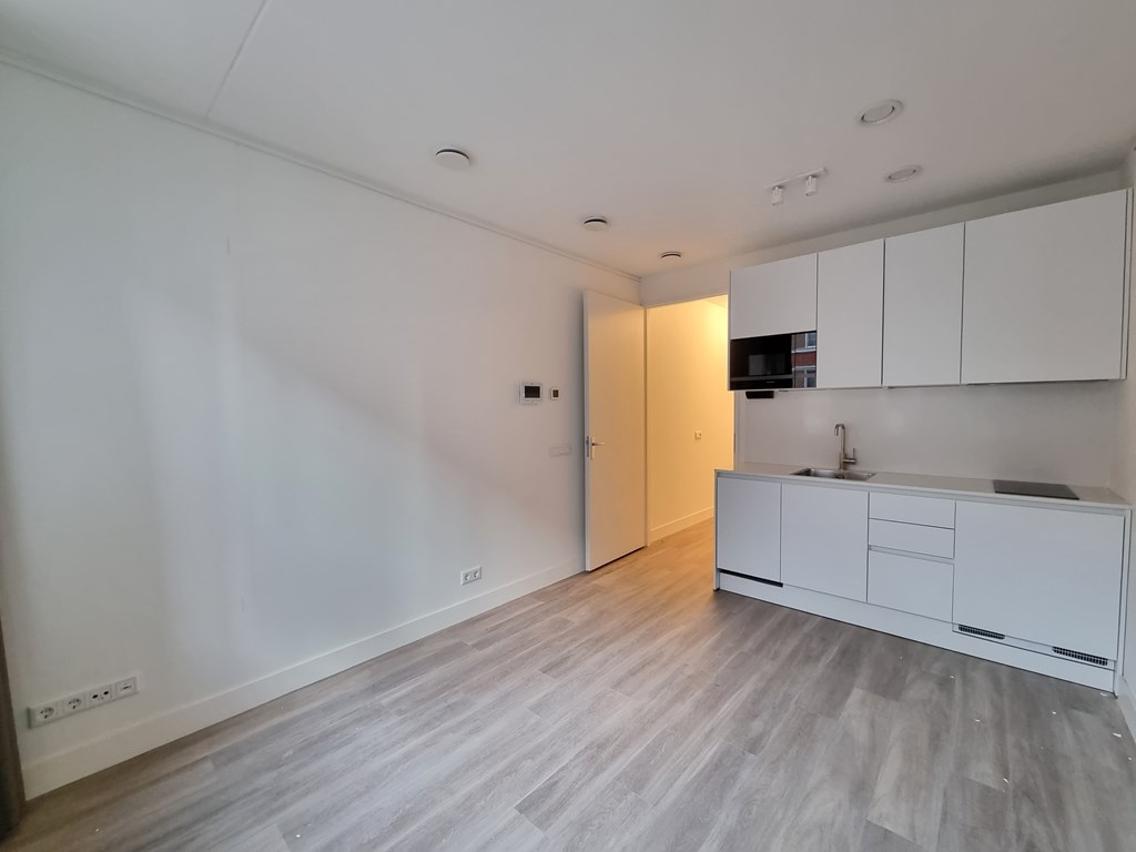 Aan de voorzijde is de ruime en lichte studio met grote raampartijen en volledig ingerichte keuken (2-pits inductiekookplaat, magnetron, koel-vriescombinatie en vaatwasser.