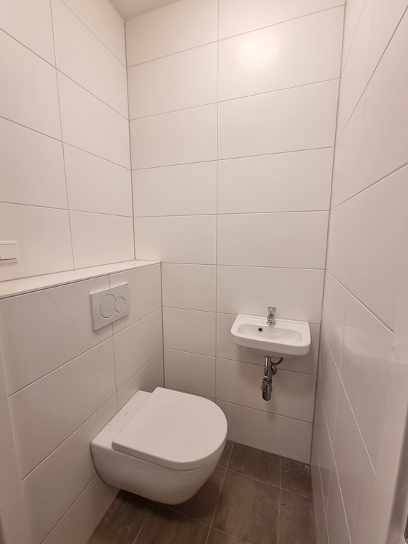 Vanuit de entree is links de cv-ketelruimte, aansluitend komt de badkamer met inloopdouche, wastafel met kast met spiegel en het hangtoilet.