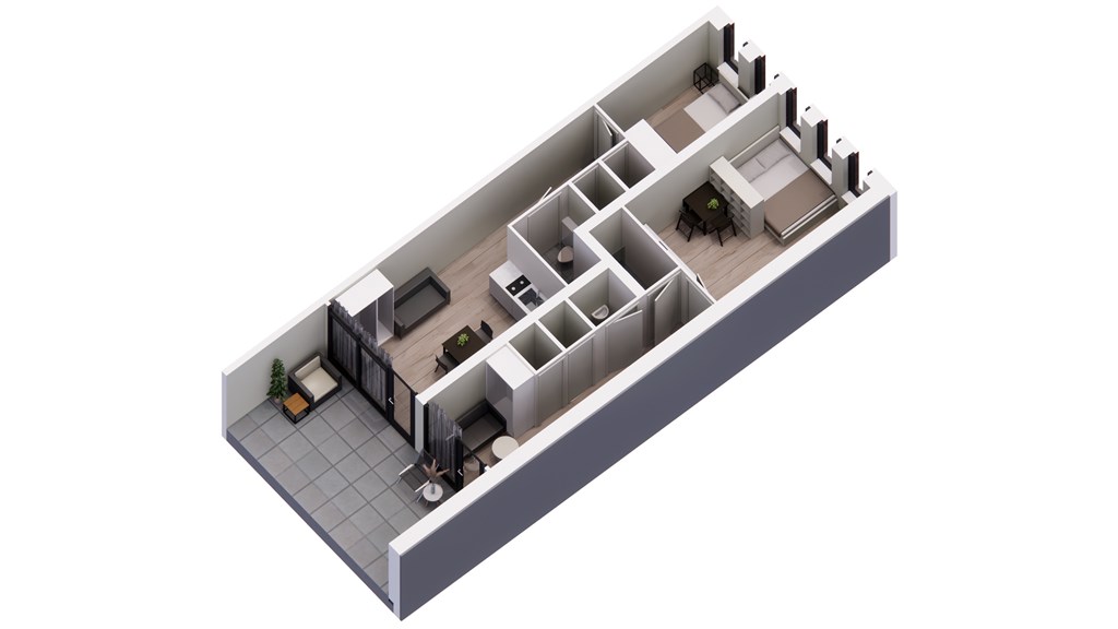 Op de foto zie je dat er in het appartement voldoende ruimte is voor een eettafel, een tweepersoonsbed en een kledingkast.