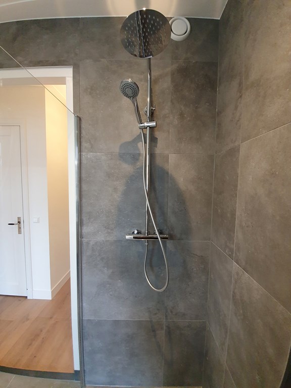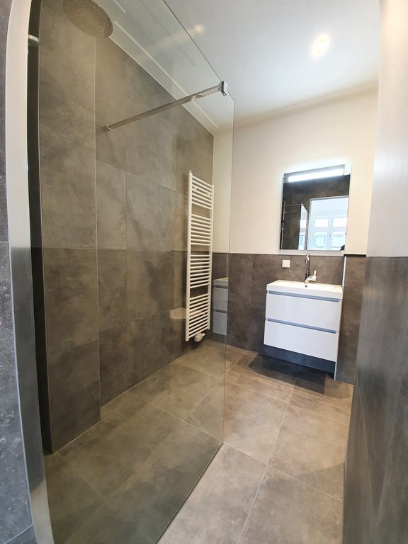 Vanuit de hal heeft u toegang tot de badkamer met dubbele wastafel, ligbad en separate een regendouche. Ook het toilet is separaat en vanuit de hal toegankelijk.