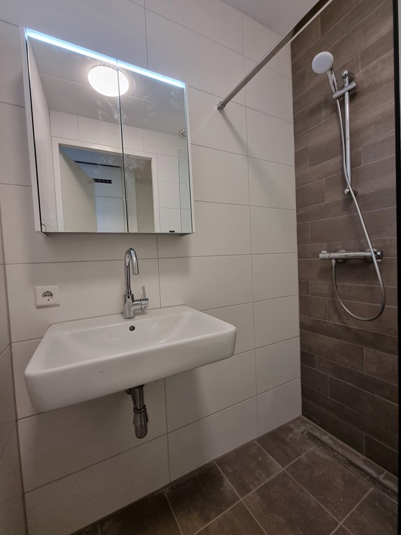 Entree via de hal. Rechts is een kleine ruimte voor de wasmachine met aansluitend de badkamer met inloopdouche, wastafel met kast met spiegel en toilet, aansluitend komt de woonkamer met open keuken voorzien van 2-pits inductiekookplaat, combi-oven, koelkast/vriezer en vaatwasser en met toegang tot het balkon en de slaapkamer.