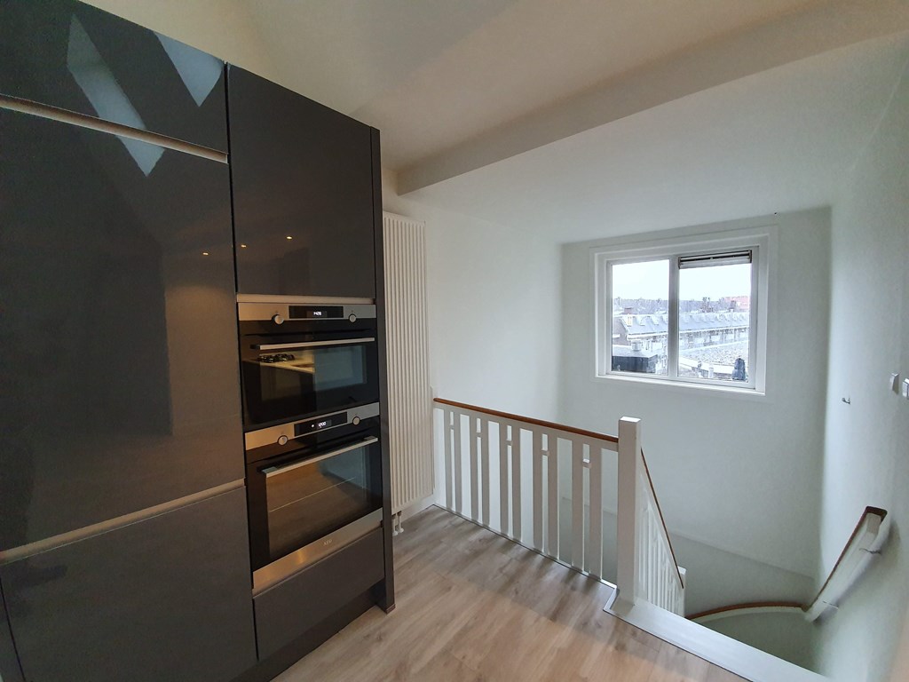 Eigen trap vanaf de 3e etage die de woonkamer binnenkomt met open keuken met houten aanrecht, grote koelkast met vriesvak, 5 pits fornuis, oven en magnetron en vaatwasser.