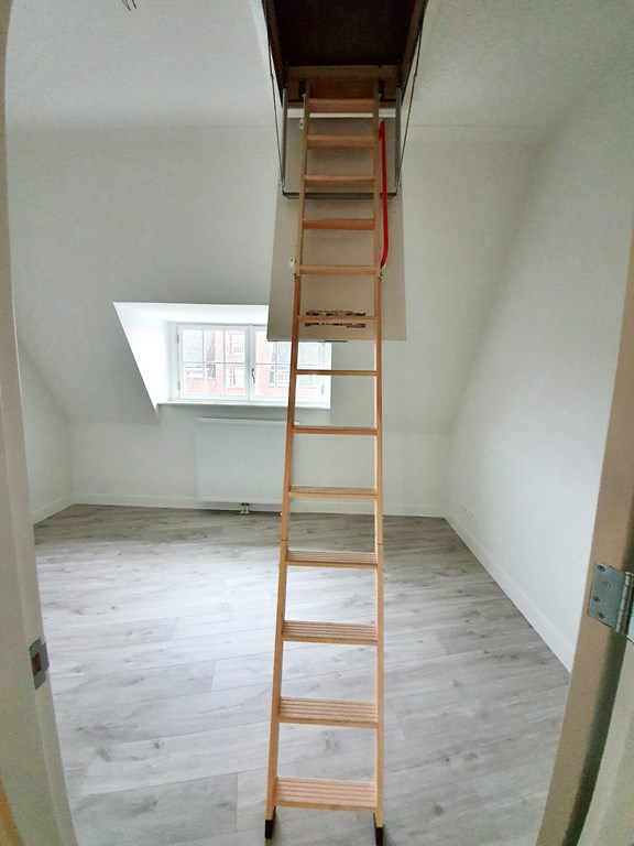 Aan de achterzijde bevindt zich de slaapkamer met toegang tot een bergzolder