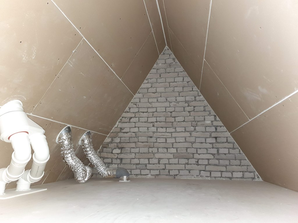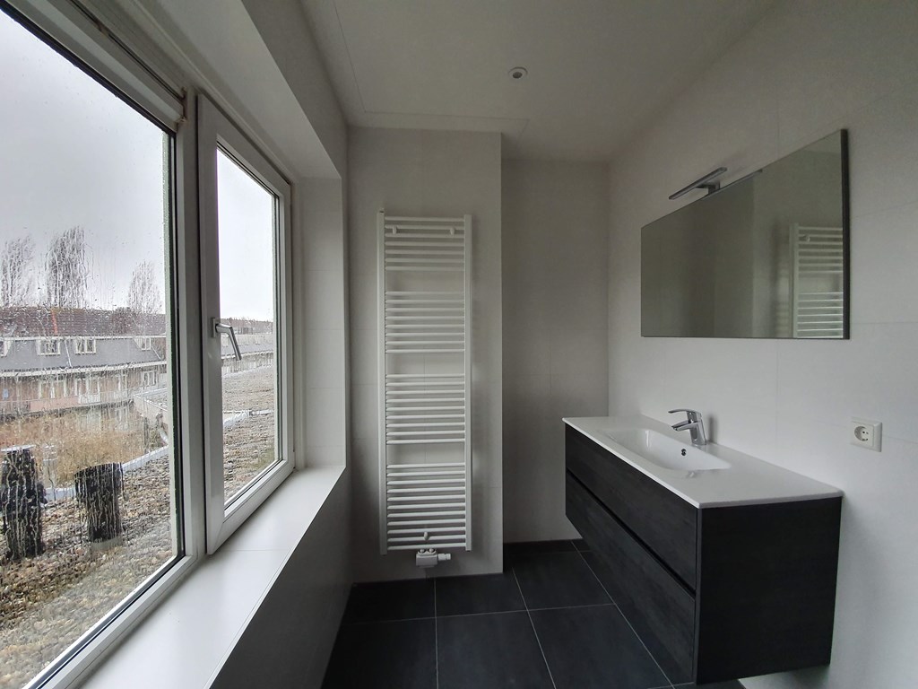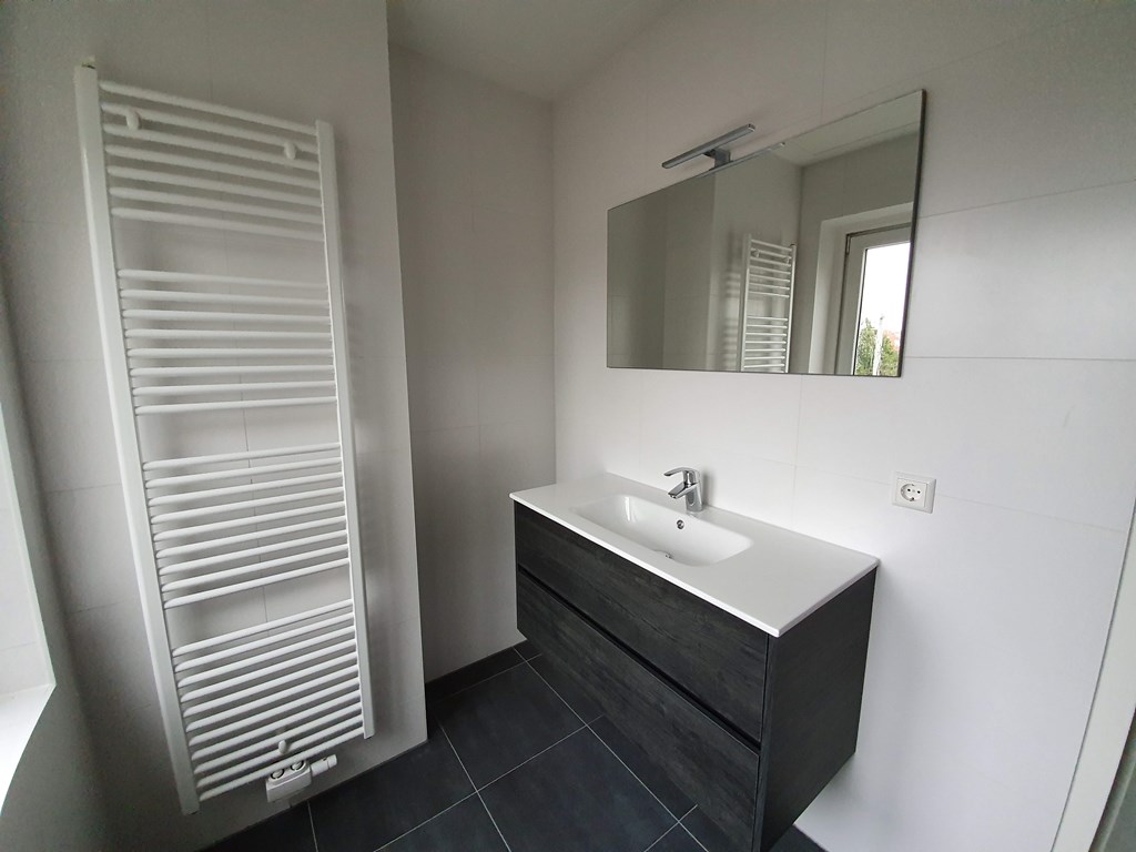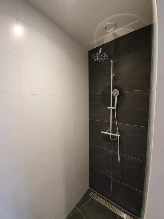 De badkamer heeft een wastafel, handdoekverwarming en inloopdouche.
